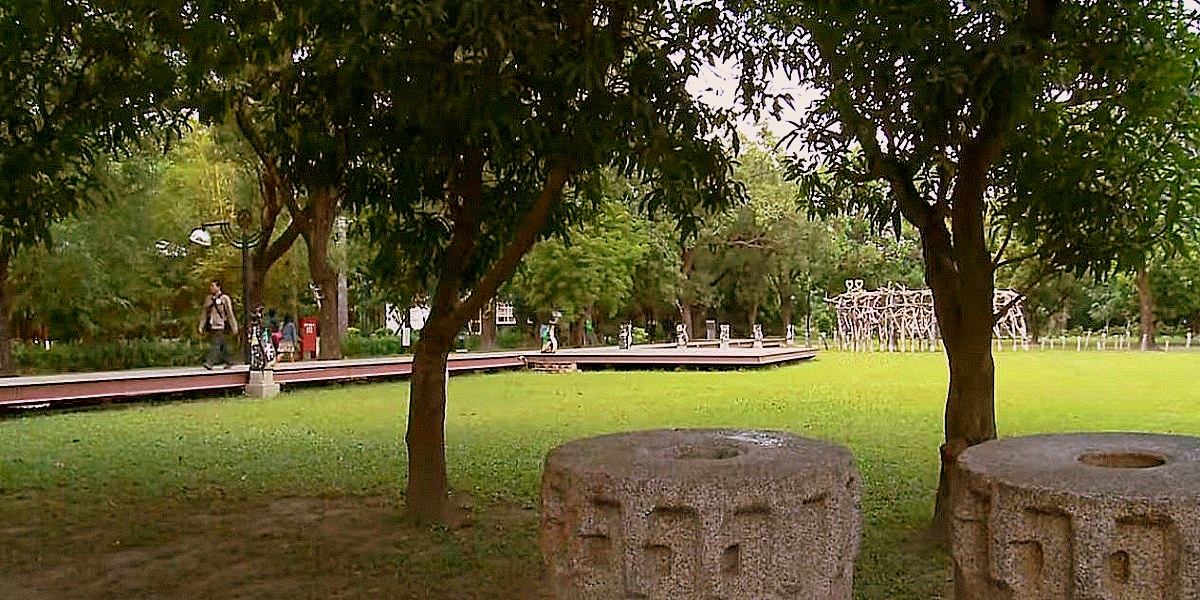 一眼望去盡是開闊的草地、景觀生態池、庭園與公共藝術,身處融合綠帶生態的建築中,整體氛圍讓人更覺心情舒暢。整修後的側邊牆面仍保留有部分的原始建築痕跡,